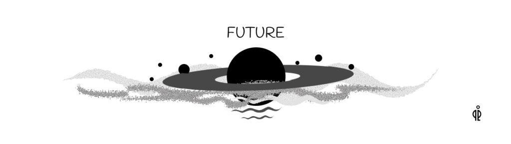 We were taught that the future is “ahead” of us—past, present, future. A linear timeline. The future as I think about it isn’t linear, we have the past and we have our present, the future, however, is created.